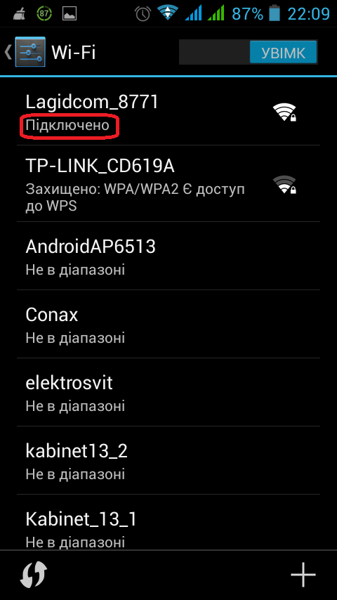 Підключаємося до точки Wi-Fi знизу під ім'ям точки писатиме підключено та